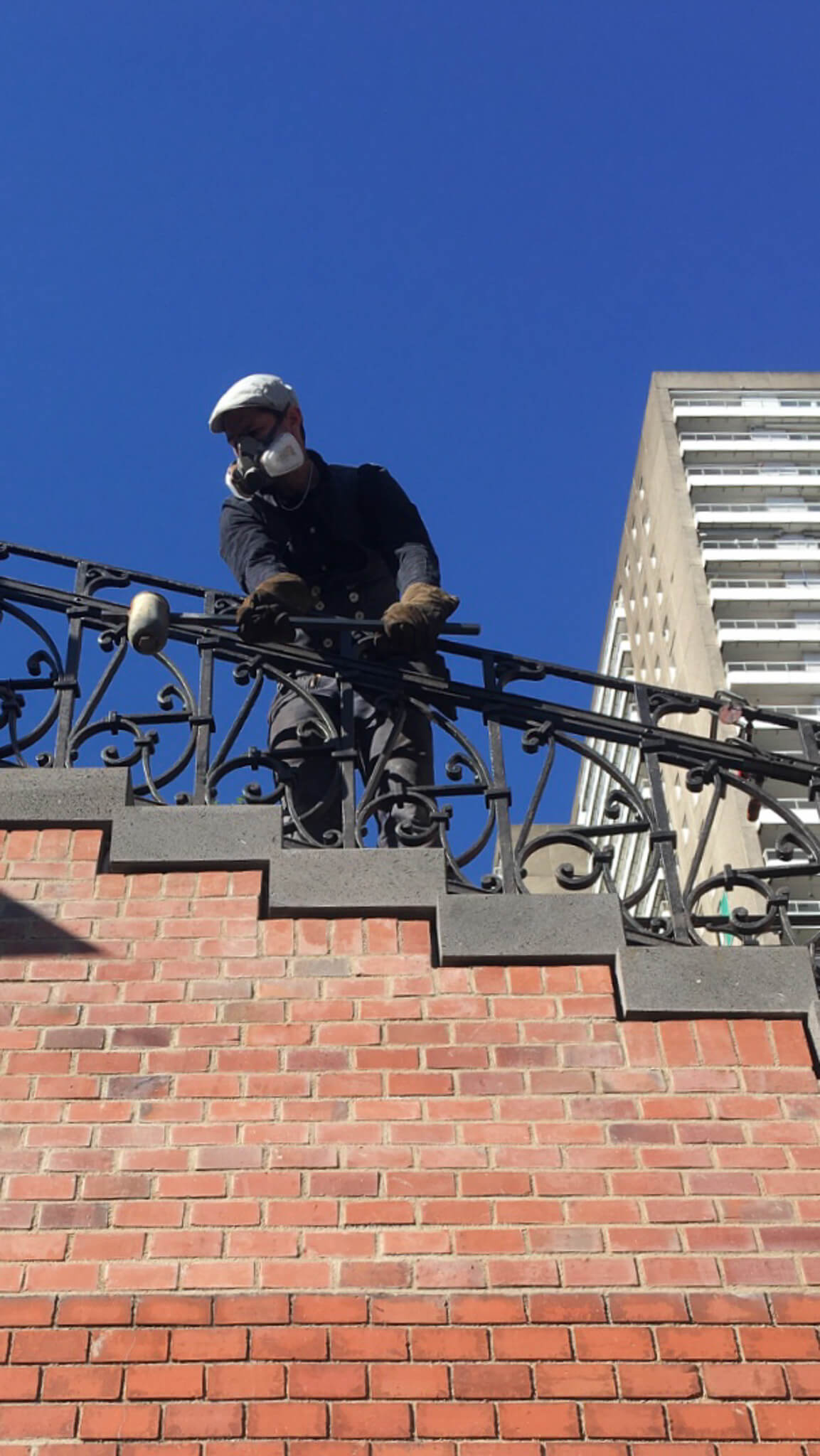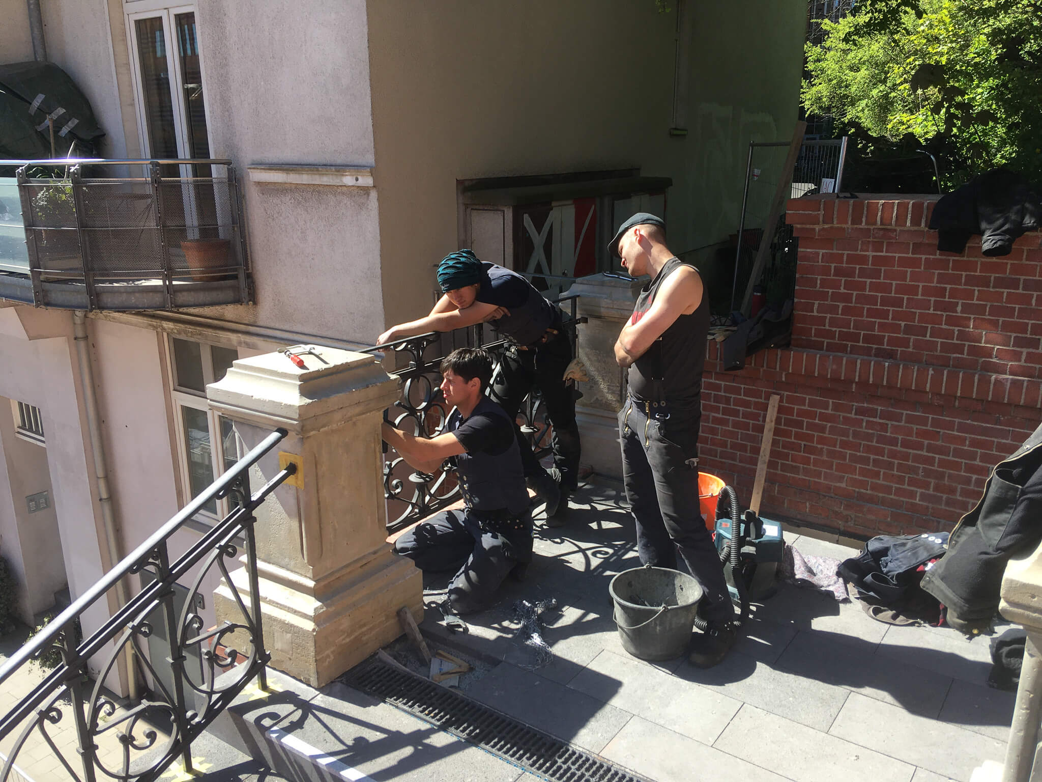 Zu Beginn der Arbeiten wurden die Geländer aus den Treppenläufen demontiert. Alte Bleivergüsse wurden vollständig entfernt und umweltgerecht entsorgt. Anschließend wurden Altbeschichtungen und Korrosion mithilfe materialschonender Strahlverfahren abgetragen.