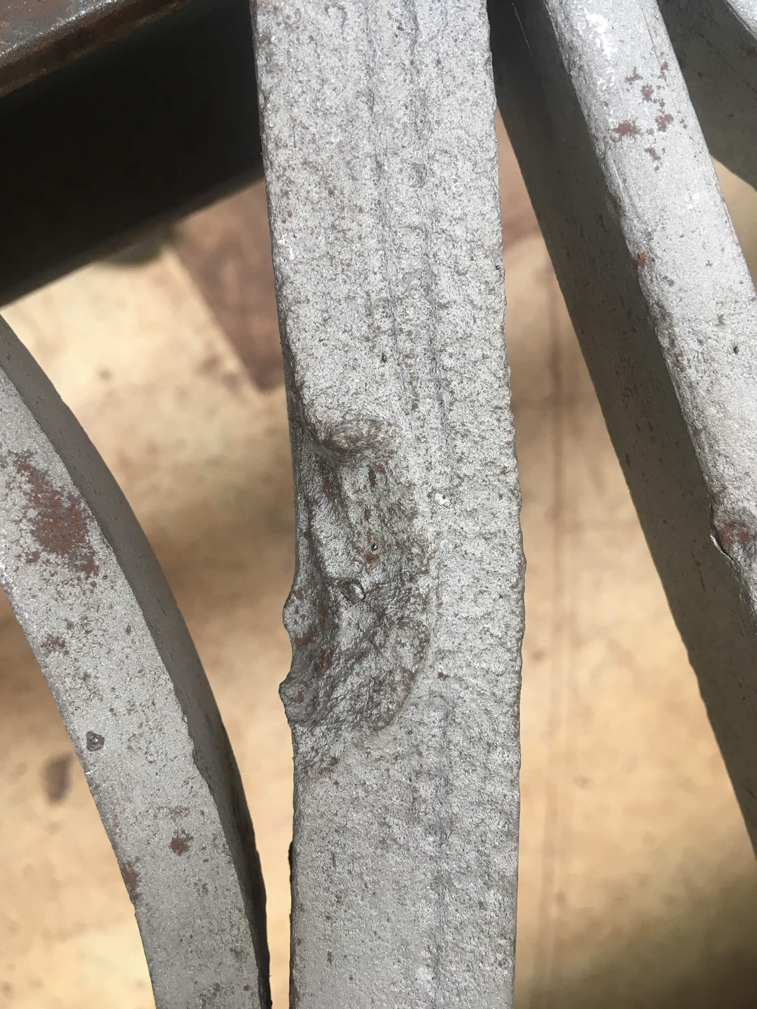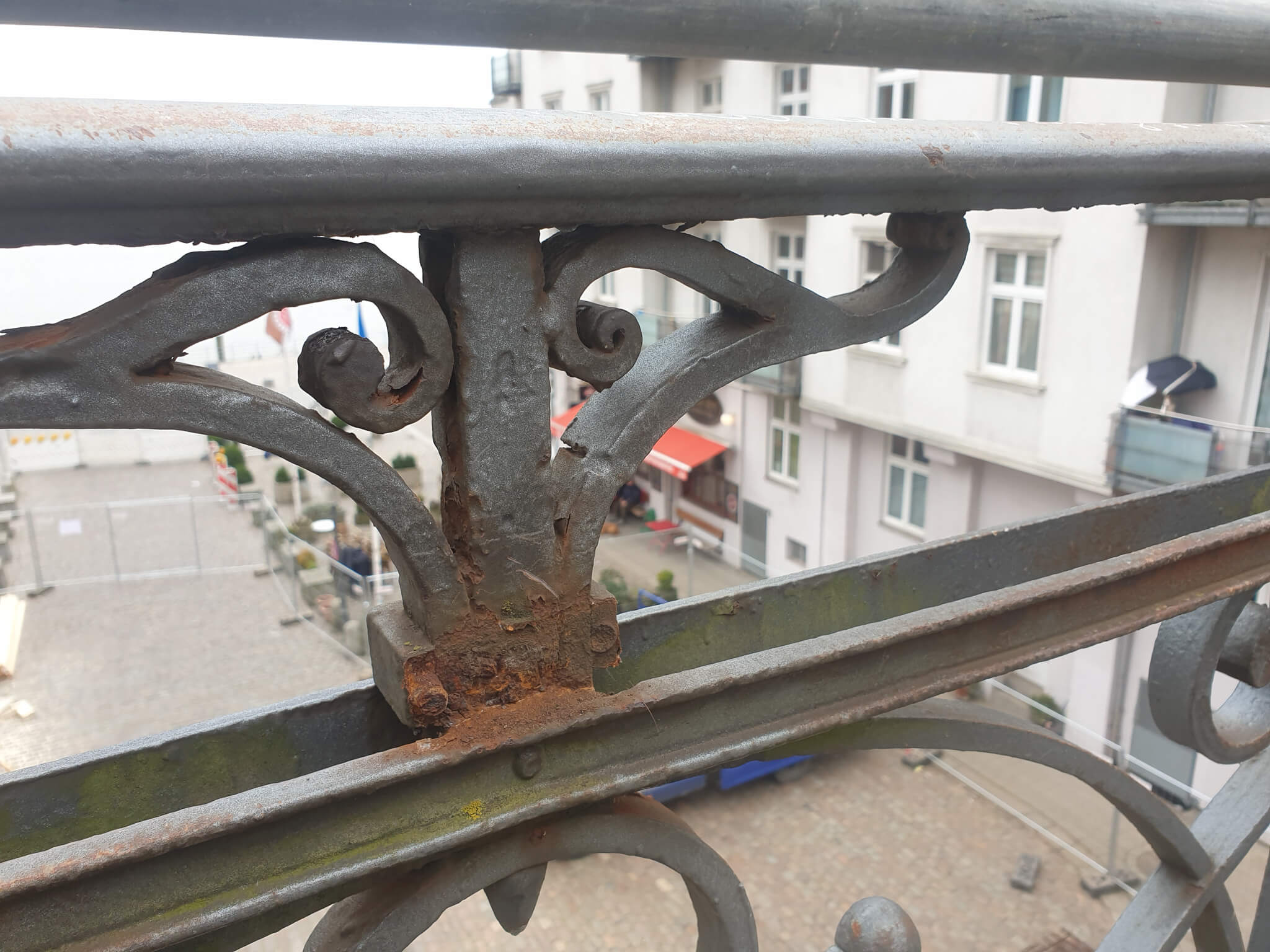 Viele der mit Nieten und Bunden gefügten Bauteile waren stark korrodiert. Rostaufweitungen hatten einzelne Konstruktionsteile auseinander gedrückt und die Stabilität der Geländer teilweise erheblich beeinträchtigt. Zudem waren im Laufe der Jahre mehrere Zierelemente verloren gegangen.